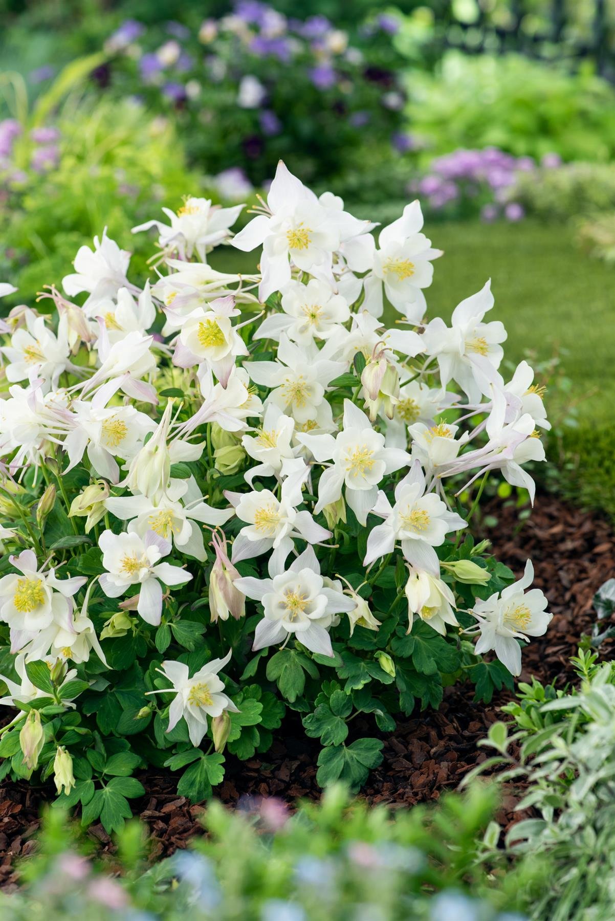 This is an early flower Aquilegia producing a compact plant with white flowers ( Height 25cm) Ideal for pots, containers and as a bedding plant