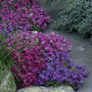 This hardy rockery perennial is an F1 hybrid form of Aubrieta that is very vigorous and uniform. The compact plants produces huge numbers of small flowers in mixed colours that will completely obscure the foliage. A must for the rockery or patio pots.