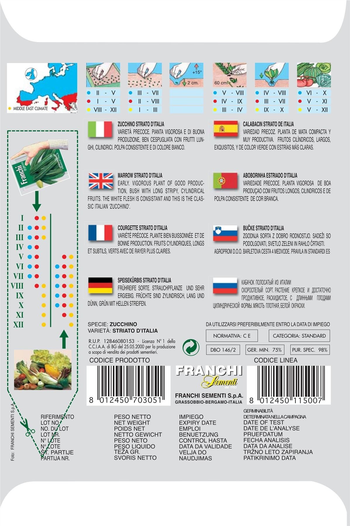 COURGETTE STRIATO D’ITALIA � Early. Vigorous plant of good production, bush with long stripy, cylindrical fruits. The white flesh is consistent and this is the classic Italian ‘zucchino’.