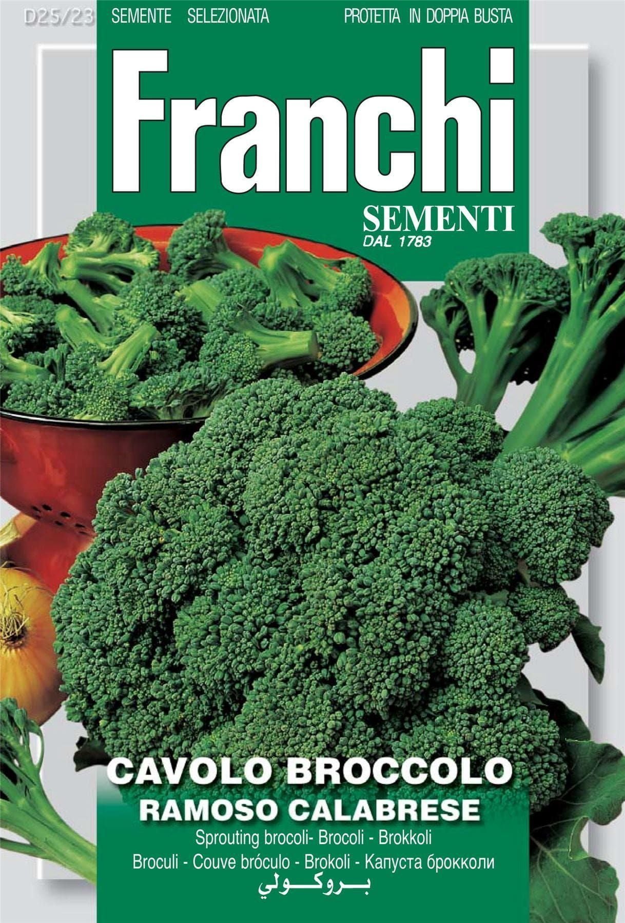 BROCCOLI RAMOSO CALABRESE Early. Tall plant with small to medium curling leaves. Medium-sized, meaty, green florets.