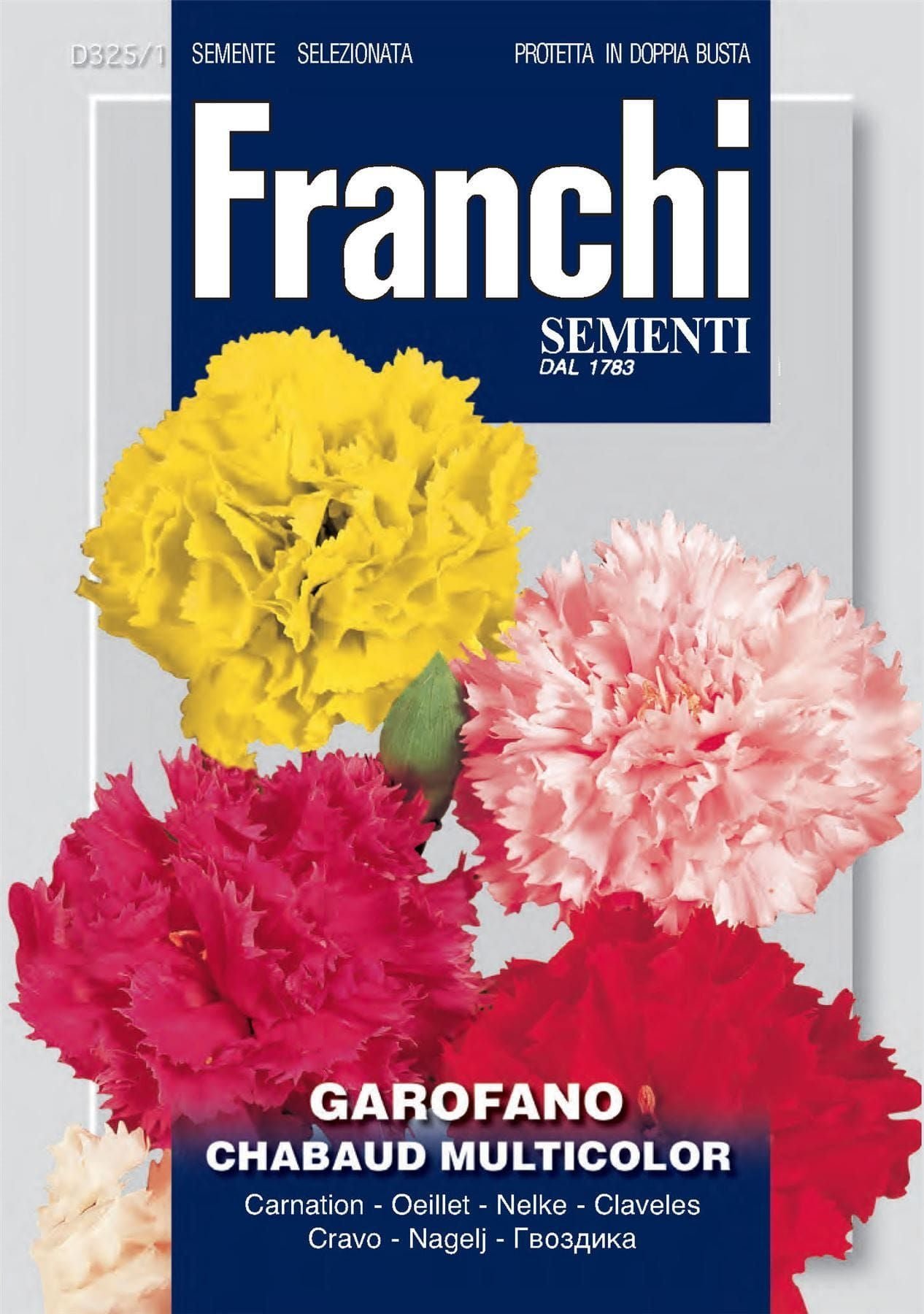 CARNATION CHABAUD MUTLICOLOR- biennial upright plant about 50cm. Producing large compact flowers mixed colour pack. Easy to cultivate and ideal for cutting, flower-beds and vases.
