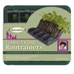 Compact Rapid Rootrainers are designed for smaller scale growing, with all the features of original Rootrainers in a more compact module. With fewer cells than Rapid Rootrainers (with 20 as opposed to 32 cells), Compact Rapid Rootrainers are ideal for the gardener who doesn’t have too much space available or perhaps doesn’t want to sow large quantities of the same seeds. ‘Books’ are held in their own slots which allows for spacing out to give plants more room as they grow. Air pruning takes place within the tray Sturdy and strong tray with drainage holes. Ideal for salads, herbs, bedding plants, plug plants and cuttings. Each pack contains: 1 holding tray, 5 books and a clear propagating lid. Rootrainers encourage vigorous, strong root formation; roots grow straight, avoiding root balls and pot bound plants. Opening the Rootrainer up in a book-like fashion allows for easy inspection of moisture levels and root progress, as well as easy removal of the young plants. Cell depth 8cm (3″) Tray Size Length 24cm (9.4″) Width 22cm (9″) Depth 9cm (3.5″). Helpful hint: Perfect for classroom or kitchen windowsills.