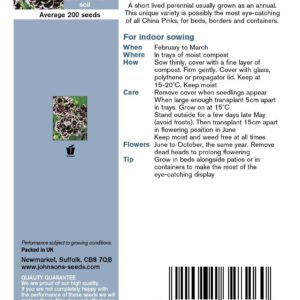 A short lived perennial usually grown as an annual. This unique variety is possibly the most eye catching of the China Pinks for beds border and containers. Sow from February to March, full details on packet.