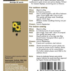 A beautiful mix of useful mid-sized branching sunflowers in gold, lemon and yellow shades. Perfect for massed displays, screening and cut flowers. Sow from March to May. Full details on packet.