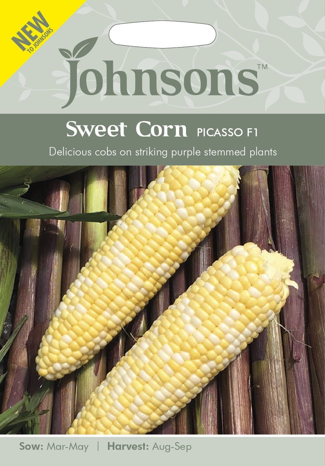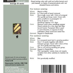 Great tasting cobs with gold and white kernels and pink tassels on highly ornamental plants with red streaked leaves and stems. Sow from March to May. Full details on packet.