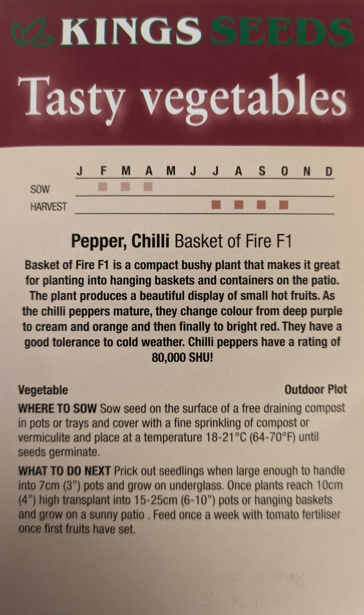 Basket of Fire is a prolific compact plant ideal for patio growing that is dripping with small hot fruit making it ideal for containers, and making it look very much like its name. The fruits mature in colour from deep purple through to cream and orange to bright red and has a good tolerance to cold weather. This chilli has a Scoville Heat Unit rating of about 80,000. Sow Feb – April