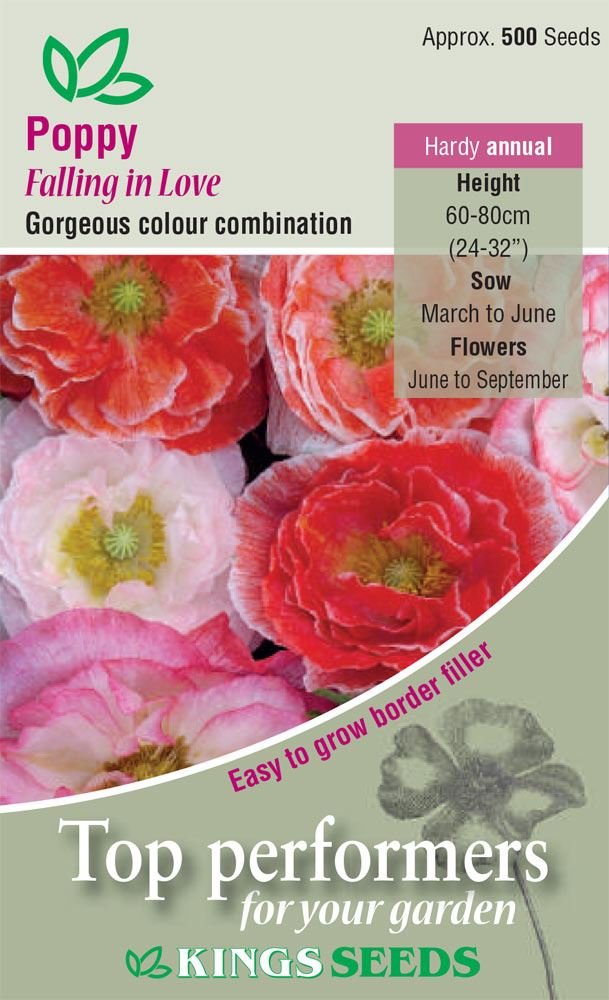 Kings Seeds – Flower – Poppy Falling In Love :- Shades of pink, coral, rose and salmon all with either semi-double, double or picotee bicoloured blooms. Hardy annual Height: 60-80cm (24-32in)
