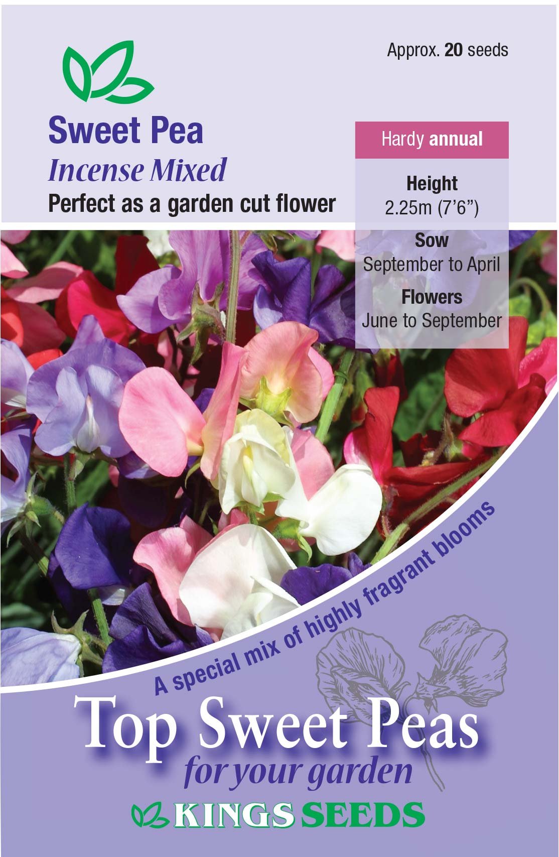 Large ruffled flowers in a wide range of colours all selected for their intense fragrance. This variety is ideal for cutting. Sweet peas are an easy to grow flower. They are undemanding and pretty well disease free but like most plants will benefit from good treatment.