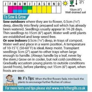 Height: 5cm(2in) Plant Class: Hardy Annual (HA).Sow outdoors: where they are to flower, 0.5cm(1/4in) deep, directly into finely prepared soil which has already been watered. Seedlings usually appear in 14-28 days. Thin seedlings to 15cm(6in) apart. Water well until plants are established and keep weed free.