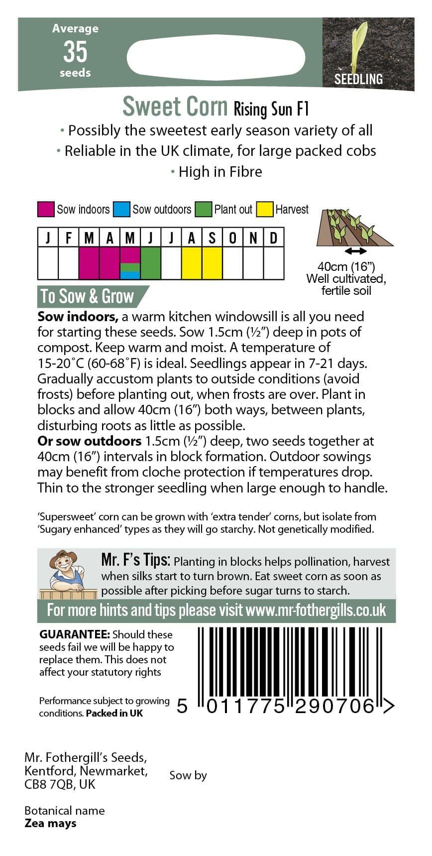 A ‘Supersweet’ variety bred to mature quickly for a shorter growing season. Possibly the sweetest early season variety of all! Very Reliable in the UK climate, showing good vigour in cold conditions and resistance to common diseases. Produces high quality crops of large kernels