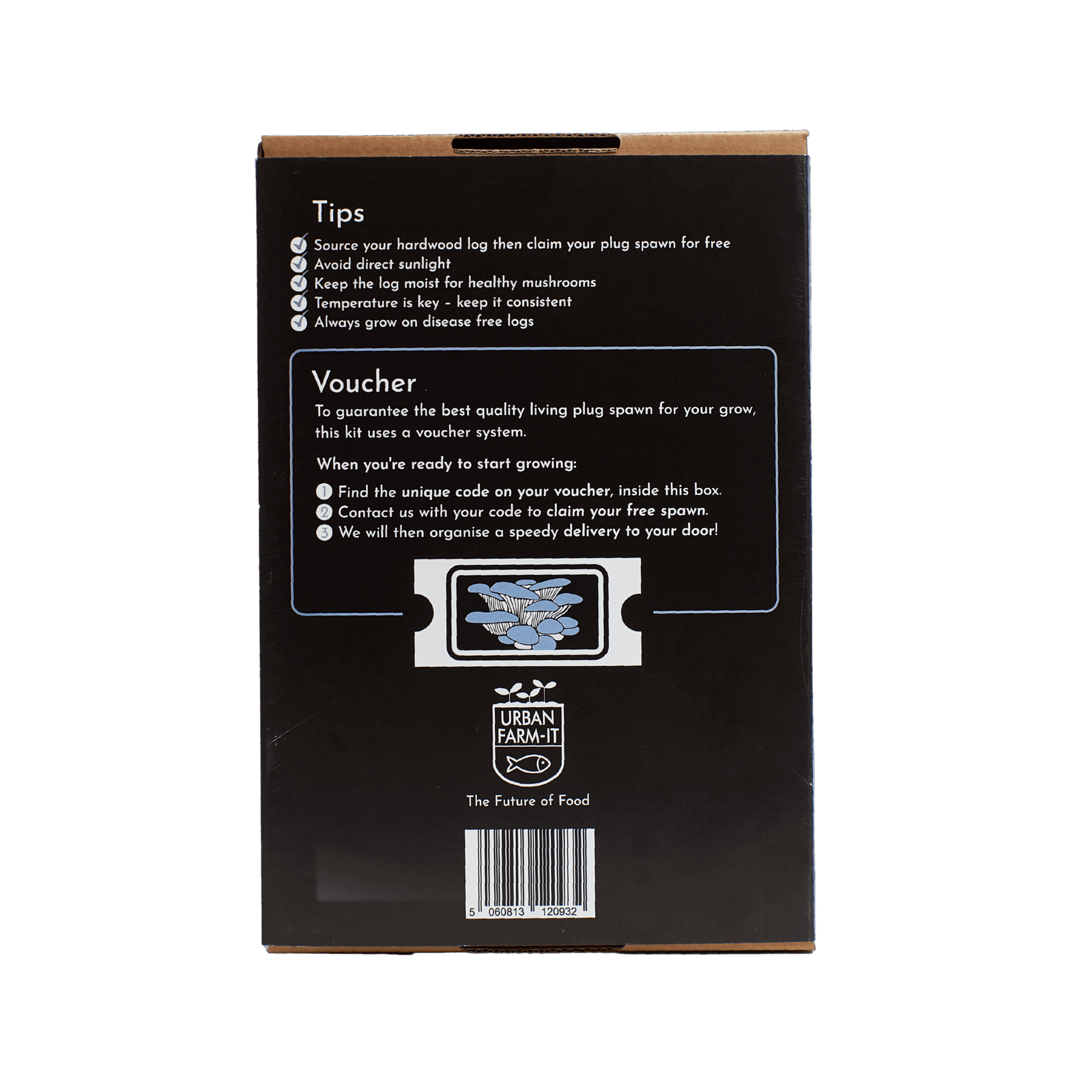 Each kit contains your voucher for 50 fresh blue oyster plugs, log sealing wax, waxing brush, drill bit and detailed growing instructions provided by experienced growers.