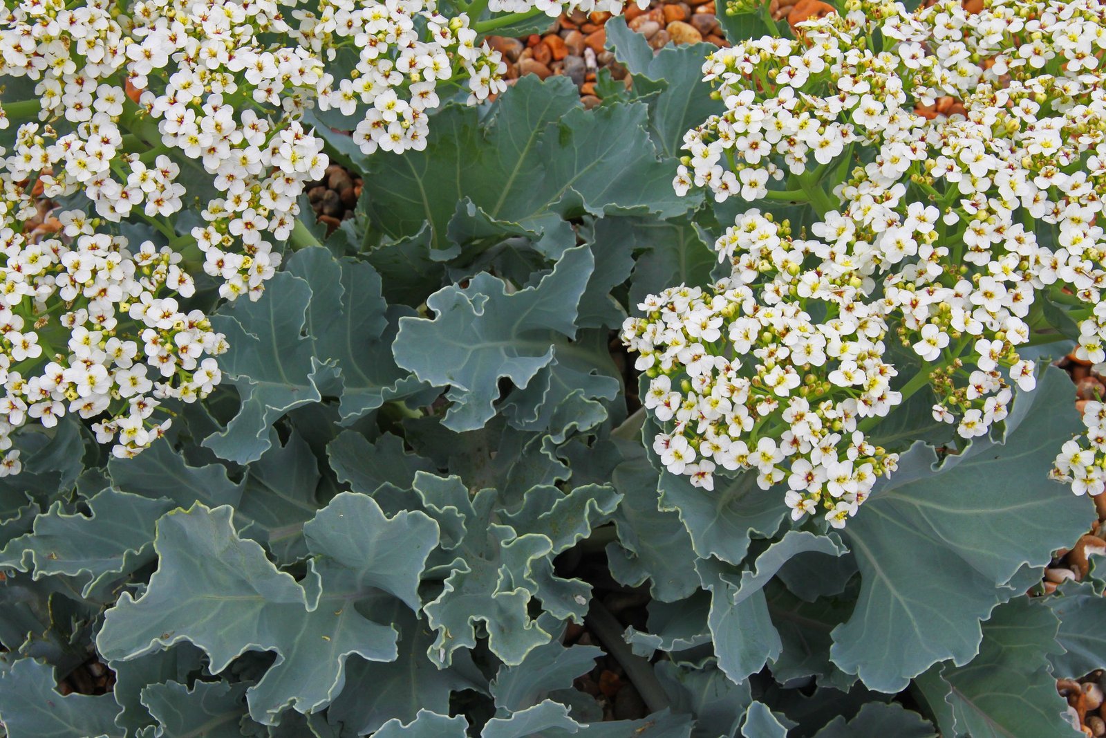 Sea kale has large, wavy-edged, bluish-green leaves that form a rosette close to the ground. The leaves are fleshy and succulent.